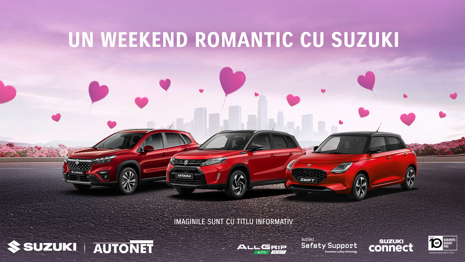 Februarie este luna iubirii, iar la Autonet fiecare test drive realizat în această perioadă poate fi începutul unei experiențe complete marca Suzuki. Programează un test drive cu modelul Suzuki preferat până pe 28 februarie și intră automat în tragerea la sorți pentru un weekend romantic la volanul Suzuki.